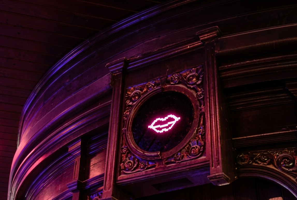 Installed as a jewel-like centerpiece above the main bar at the Den at PLAY (Museum of Sex, creative direction by Emilie Baltz), the Beacon communicated directly with servers, quietly indicating when drinks and plates were ready for pickup. At the same time, it performed for the public: a looping display of animated, suggestive icons that transformed back-of-house signals into a playful visual experience.